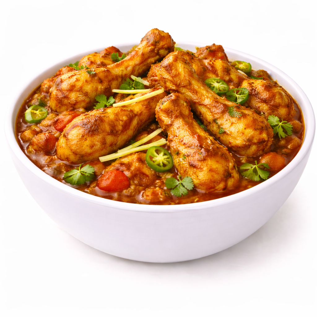 Chicken cooked with onions, tomatoes, green chillies and spices in a rich spiced gravy.