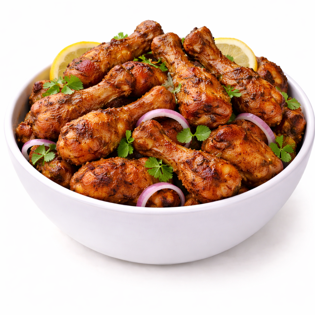 Whole chicken marinated in aromatic tandoori spices, cooked to perfection in a traditional clay oven for a smoky flavour.