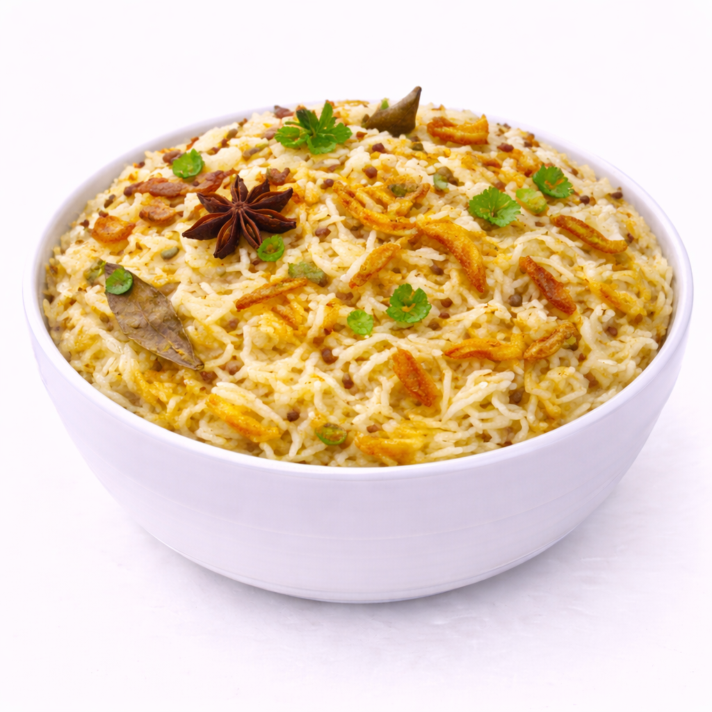 Aromatic basmati rice slow-cooked with rich Hyderabadi spices for a fragrant dum-style flavour.