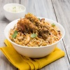 Aromatic basmati rice and tender chicken dum biryani served with Chicken 65 and boiled egg.