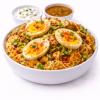 Aromatic biryani with basmati rice, vegetables, egg, spices, and fresh herbs.