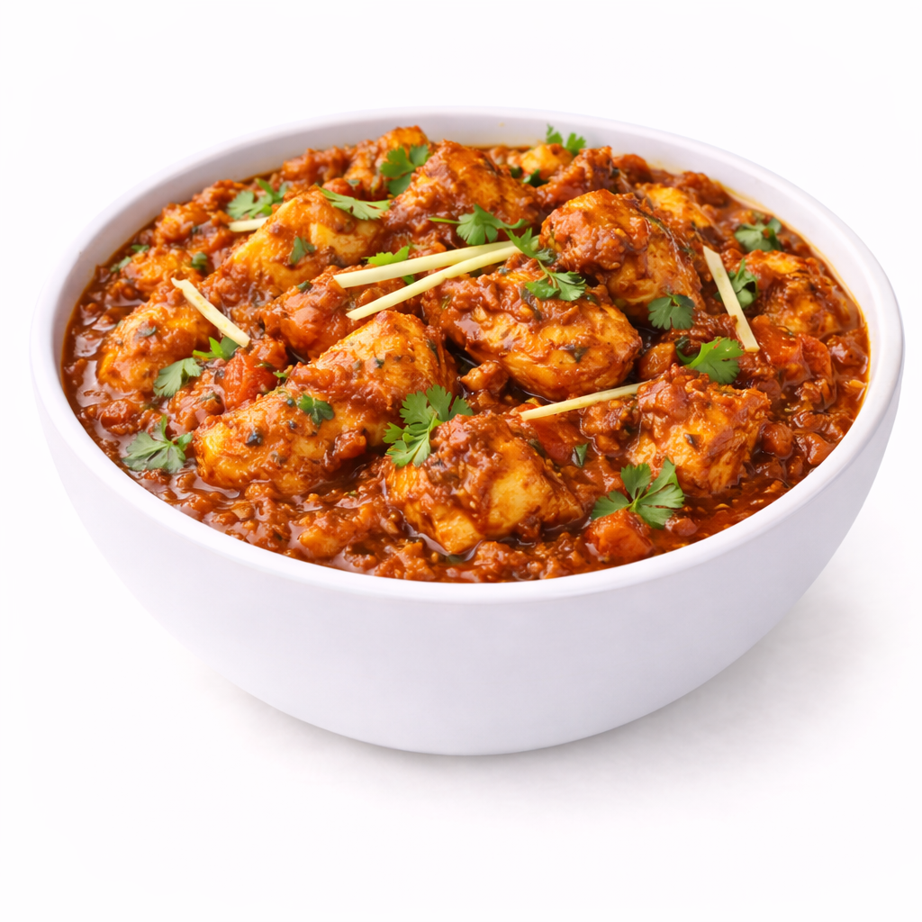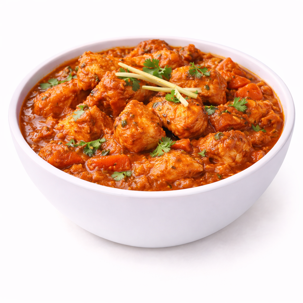 Spicy bhuna-style chicken cooked in rich onion, tomato and curd gravy.