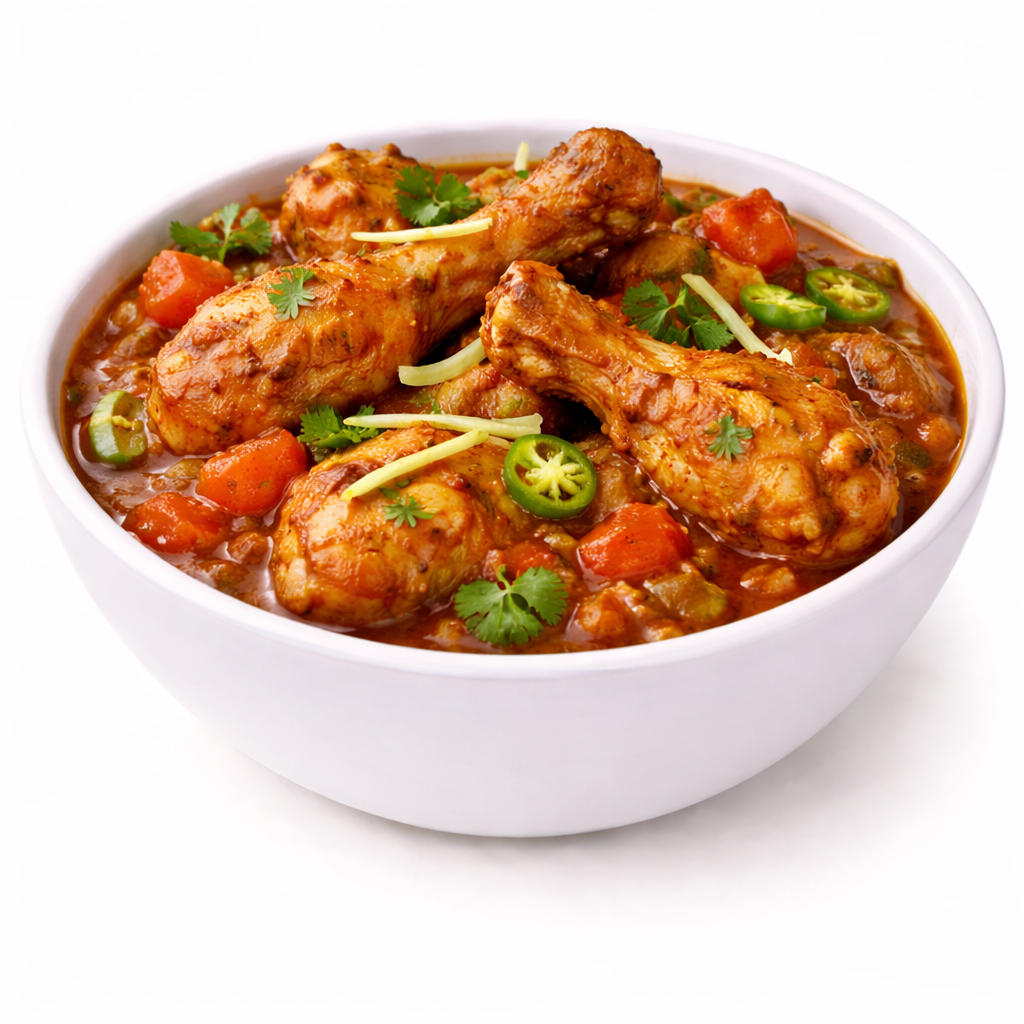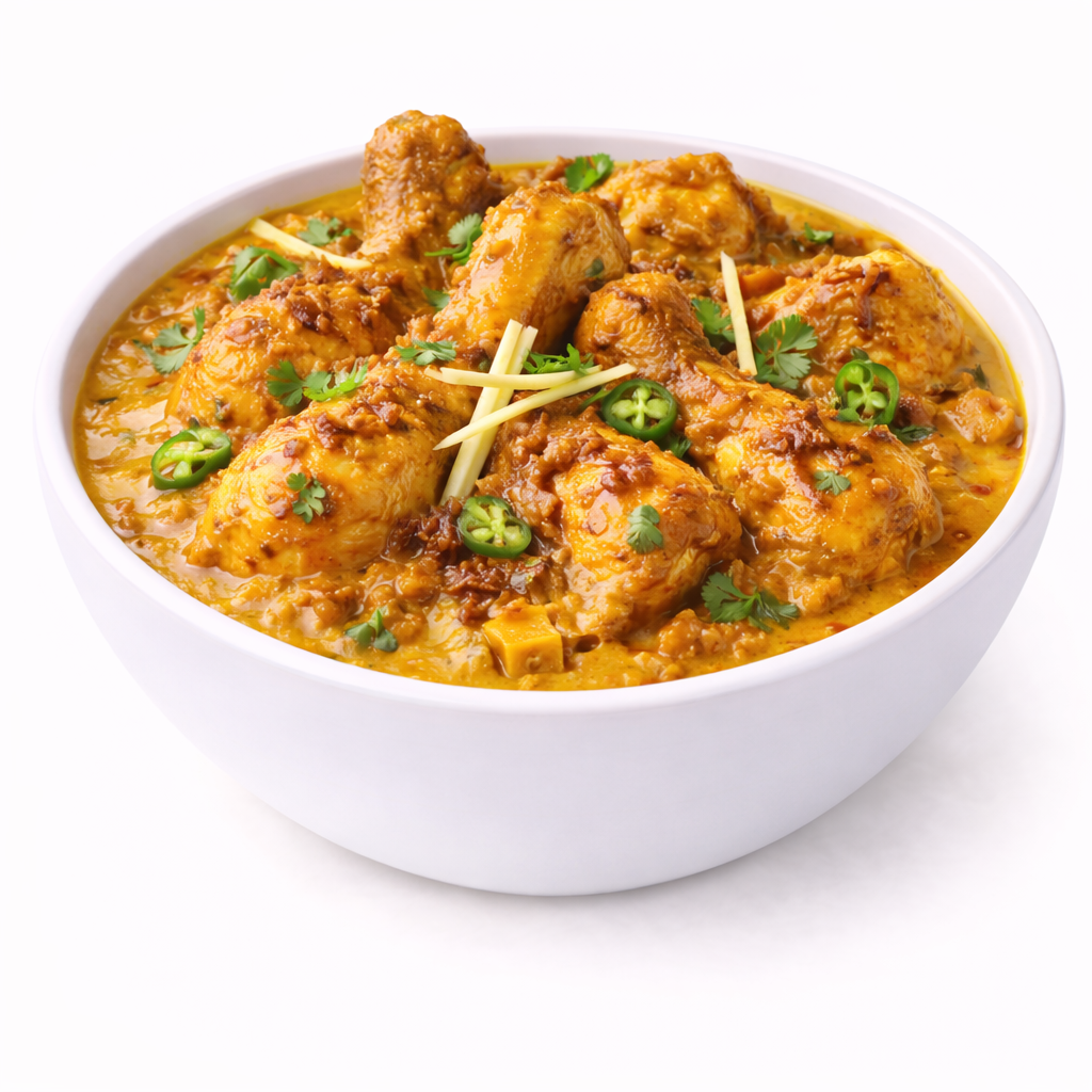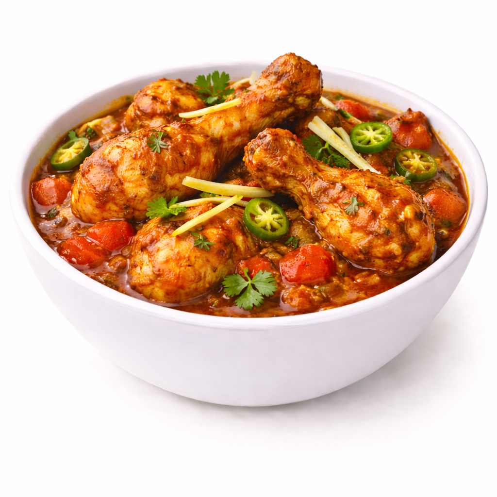 Chicken cooked with onions, tomatoes, green chillies and spices in a rich spiced gravy.