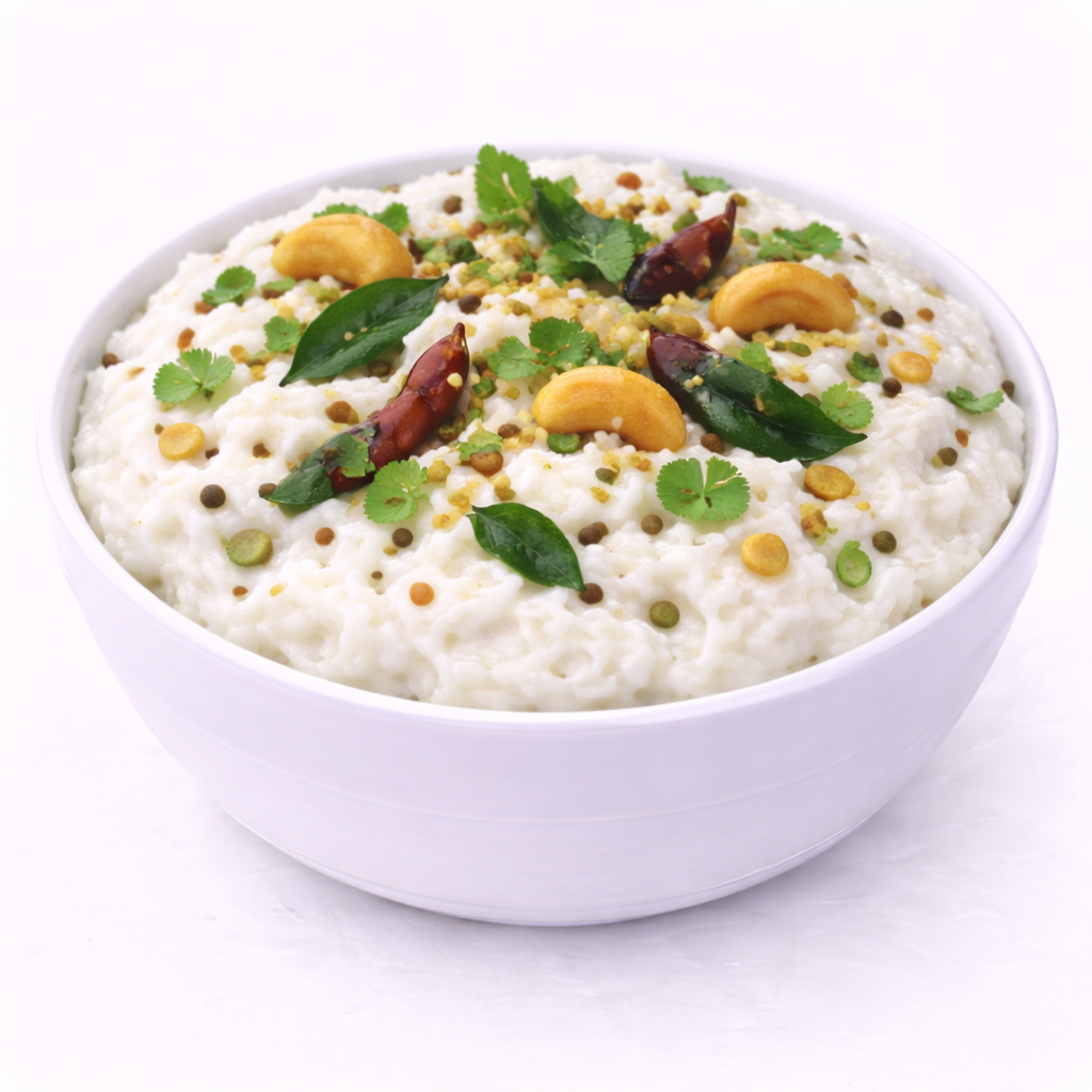 Cooked rice mixed with yogurt, salt, and tempered mustard seeds for a cooling, soothing dish.